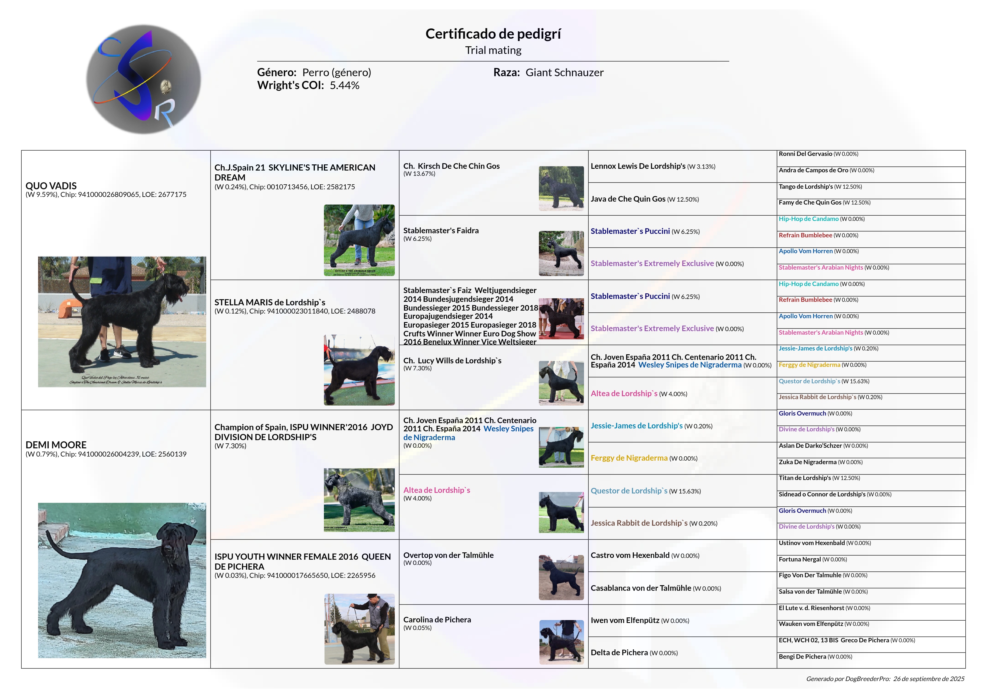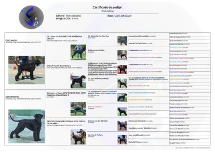 • Con copia de las certificaciones de los progenitores (títulos y sanitarios. Test Combibreed Grupo 2, Pack Schnauzer miniatura Laboklin, Wisdown Panel y perfil ADN progenitores)